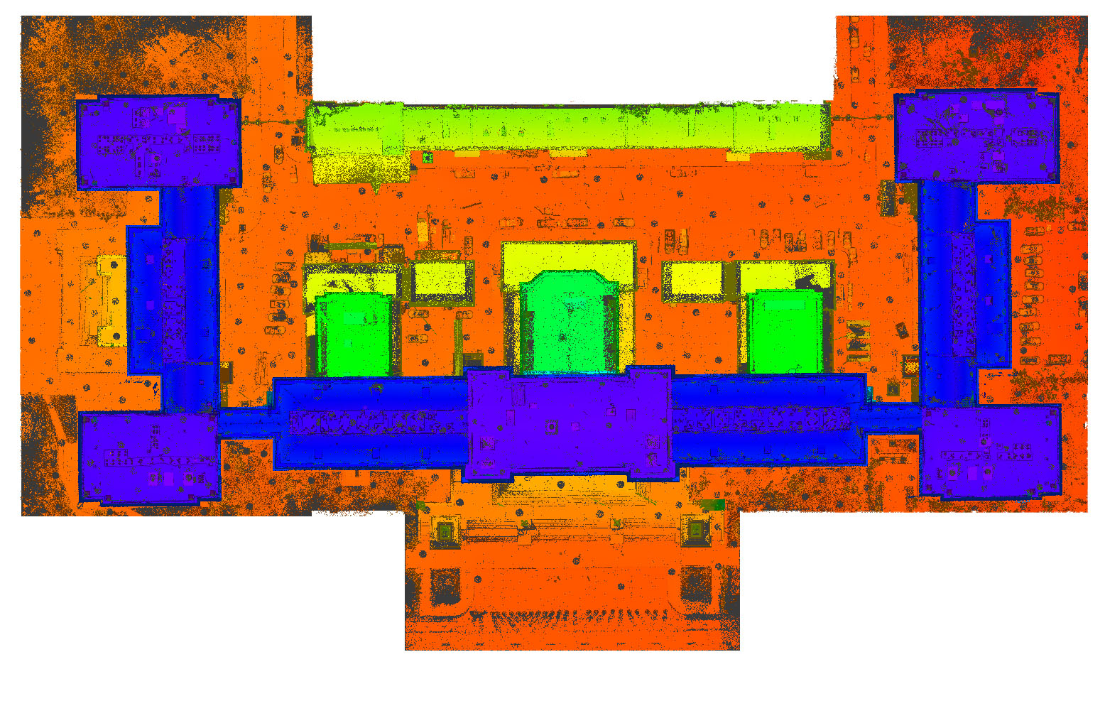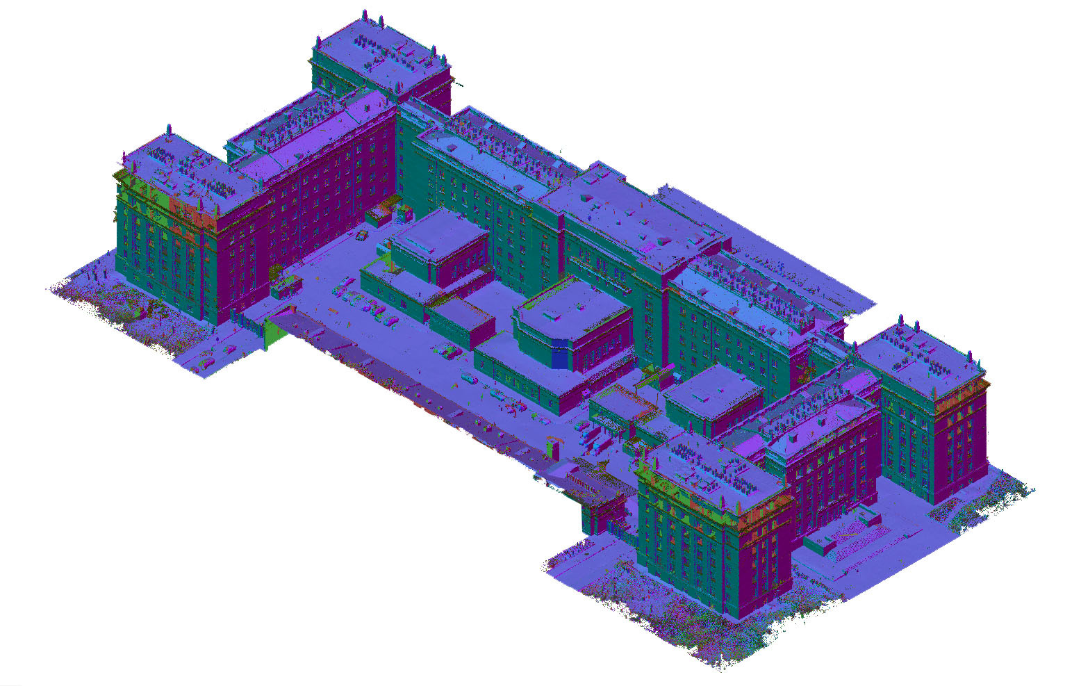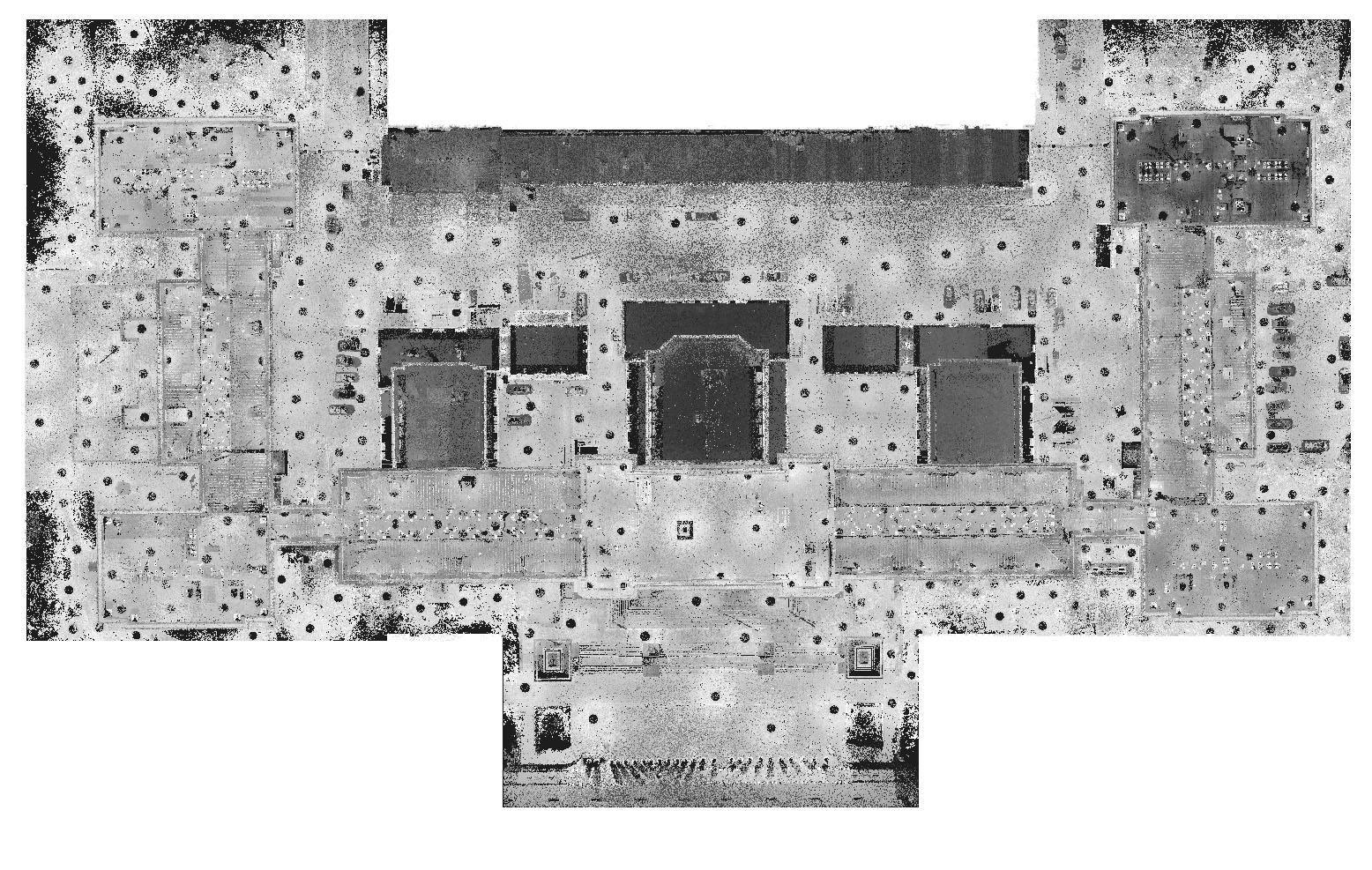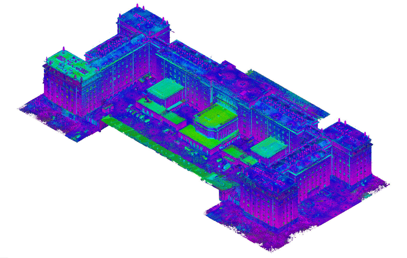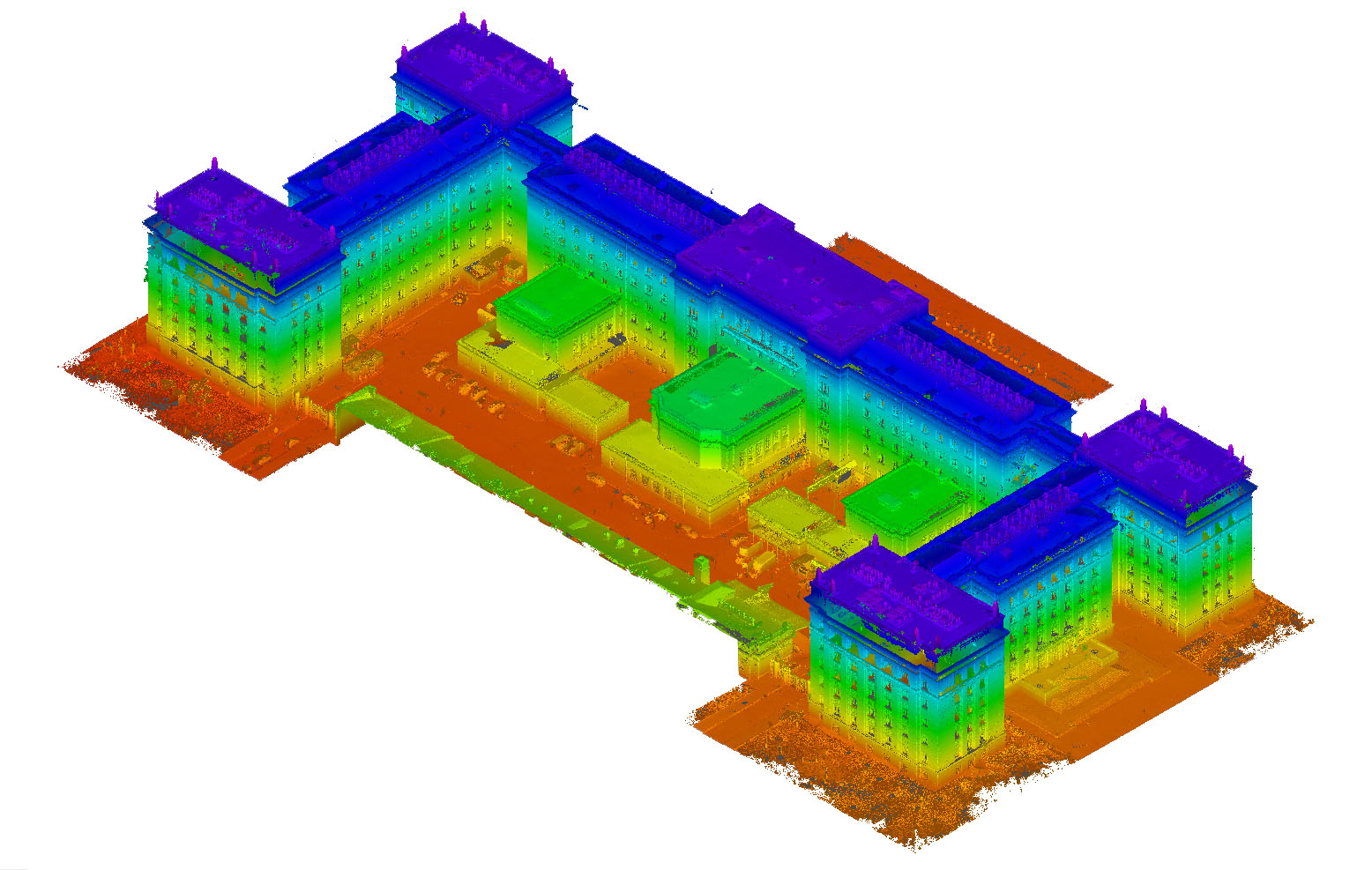 Основной задачей было выполнение лазерного сканирования фасадов зданий МГУ для создания точных чертежей, необходимых для последующей реставрации. Из-за плотного примыкания деревьев и запрета на использование дронов для аэросъёмки пришлось организовать работу более тщательно. Мы использовали два периметра сканирования — ближний и дальний, а также добавили сканирование с кровли, чтобы обеспечить максимальное покрытие фасадов.