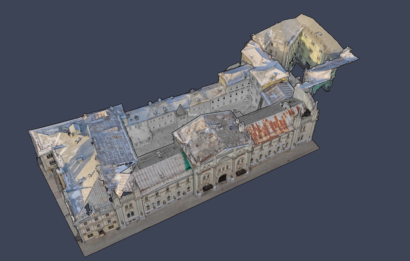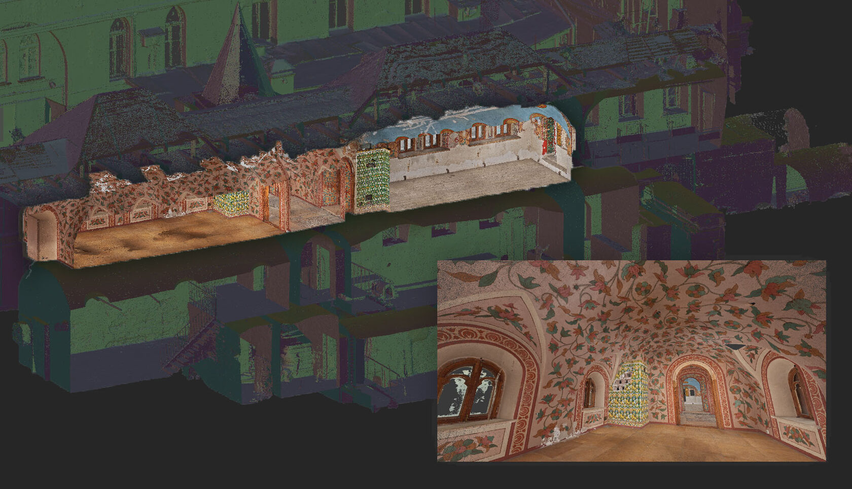 Из-за ограничений полётов в зоне около Кремля и невозможности использования дронов, мы применили лазерные сканеры Faro и ручную камеру Sony для выполнения съёмки. Для получения детализированных снимков фасадов и интерьеров использовались крыши соседних зданий, что позволило обеспечить качественную оцифровку всех частей объекта.