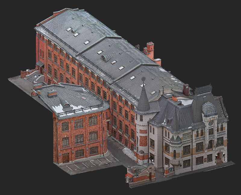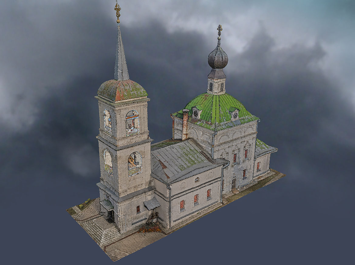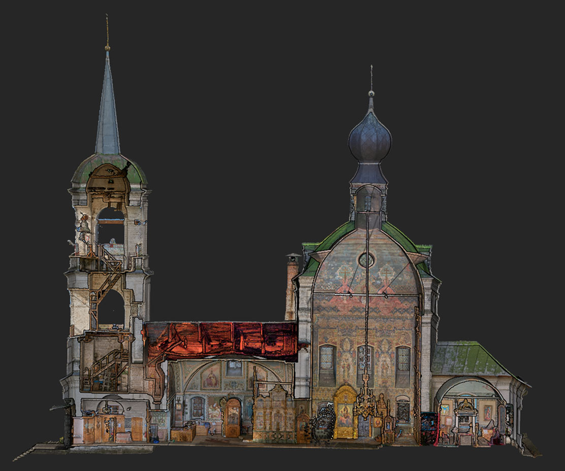 Один из самых сложных объектов для съёмки. Ветви деревьев прилегают к двум фасадам, высота 38 метров, внутри темно и всё покрыто монументальной живописью. Оцифровка выполнялась лазерными сканерами Faro, квадрокоптером DJI и ручными камерами Sony. Благодаря правильно подобранному освещению и высотным штативам удалось собрать абсолютно все материалы по интерьерам и фасадам. Высокодетальные ортофотопланы, облака точек и текстурированные модели были сданы заказчику.