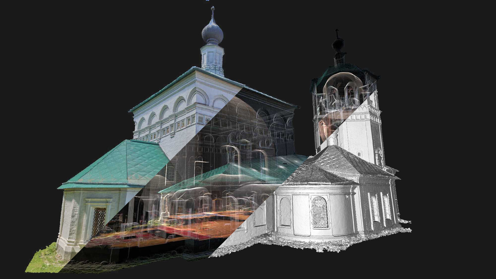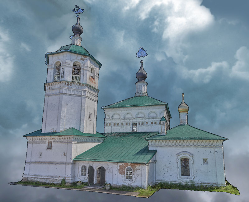 Фотограмметрическая съёмка дополнила нашу работу, предоставив текстурированное изображение поверхности здания. С помощью этого метода мы смогли воссоздать реальный внешний вид фасадов церкви, что позволяет точно передать исторический облик и сделать реконструкцию максимально аутентичной.