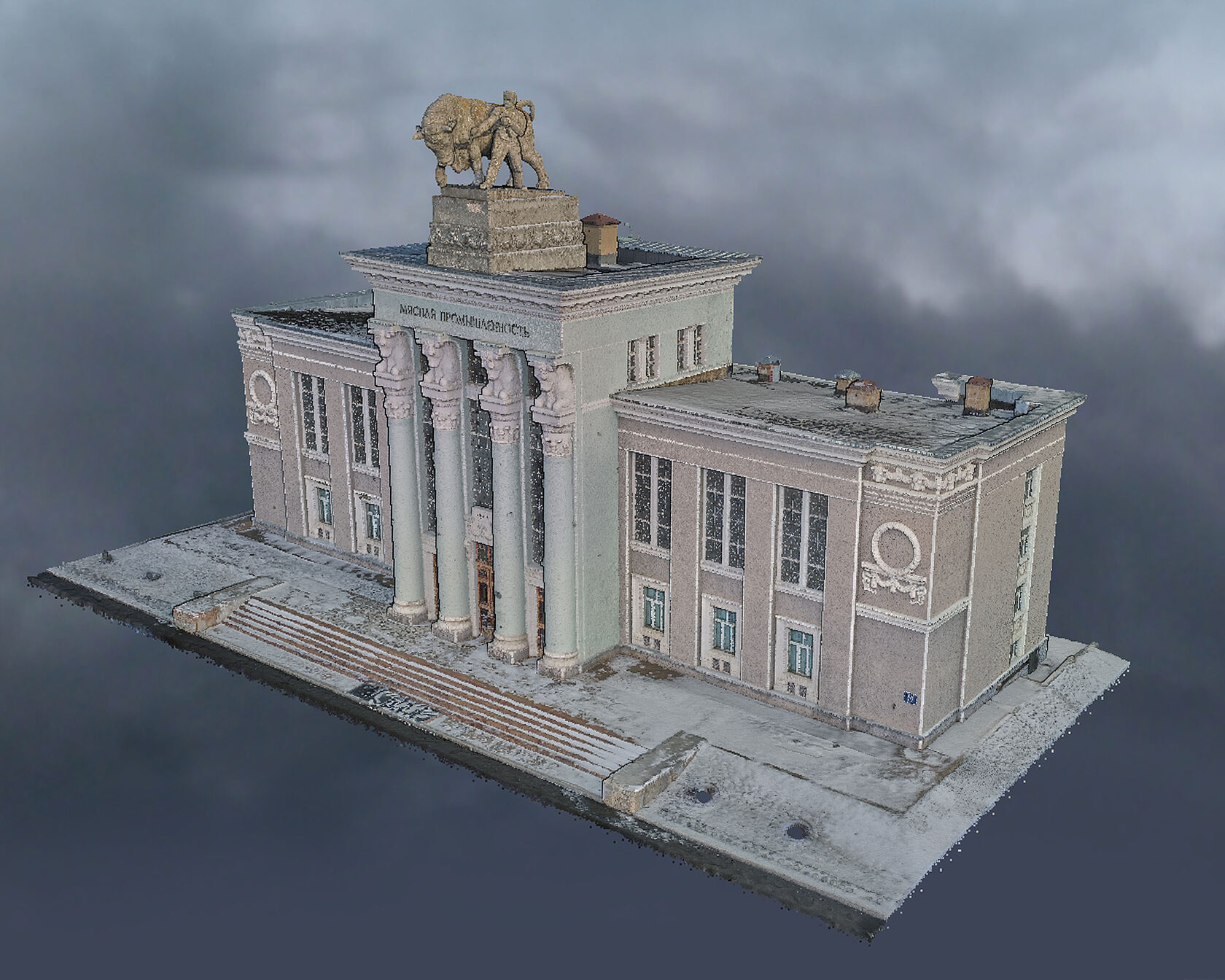 Наша команда провела сканирование как внешних, так и внутренних элементов здания. Лазерное сканирование обеспечило получение данных о геометрии фасадов, а с помощью дронов были отсняты все элементы кровли и внешних стен. Эти данные легли в основу создания точных чертежей и ортофотопланов, необходимых для реставрации.