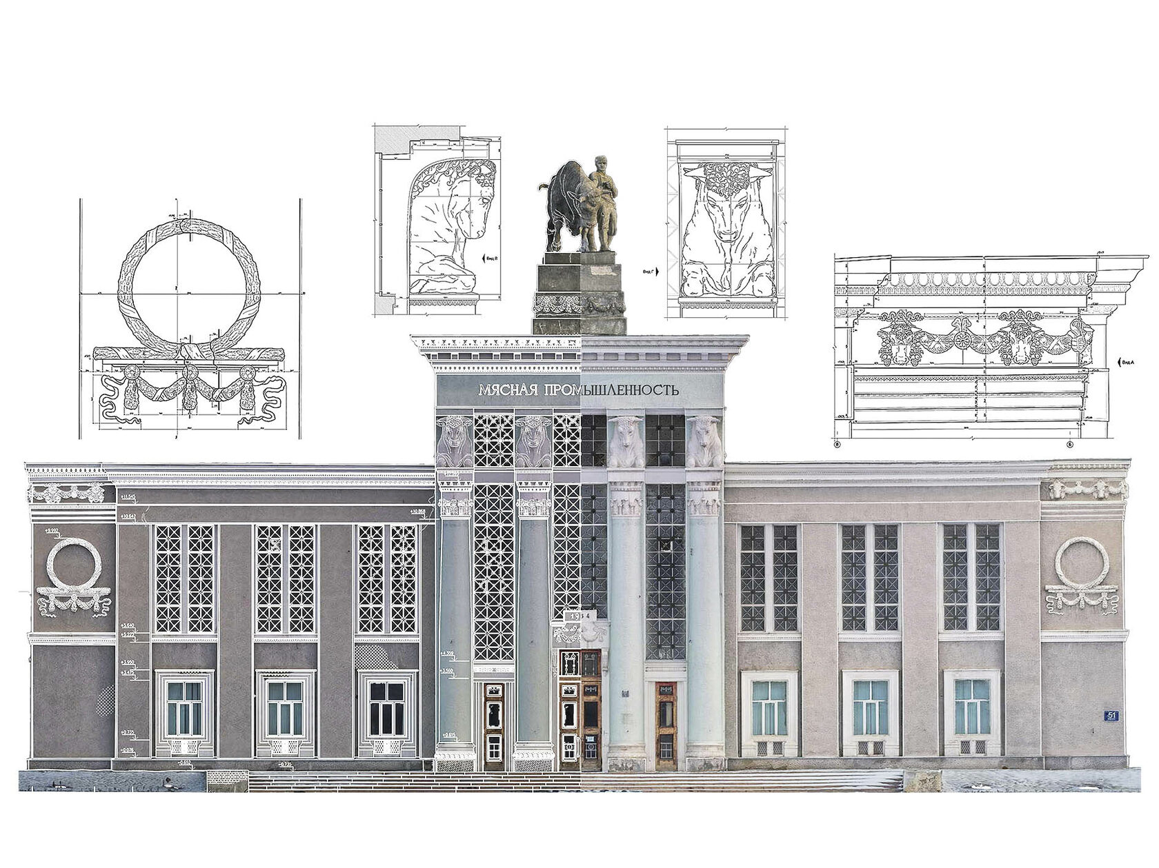 Фасады и кровля павильона были отсняты с воздуха с помощью дрона, что позволило нам получить высокодетализированные ортофотопланы с разрешением 1 мм на пиксель. Лазерное сканирование с использованием Faro s150 обеспечило точную оцифровку каждого архитектурного элемента здания.